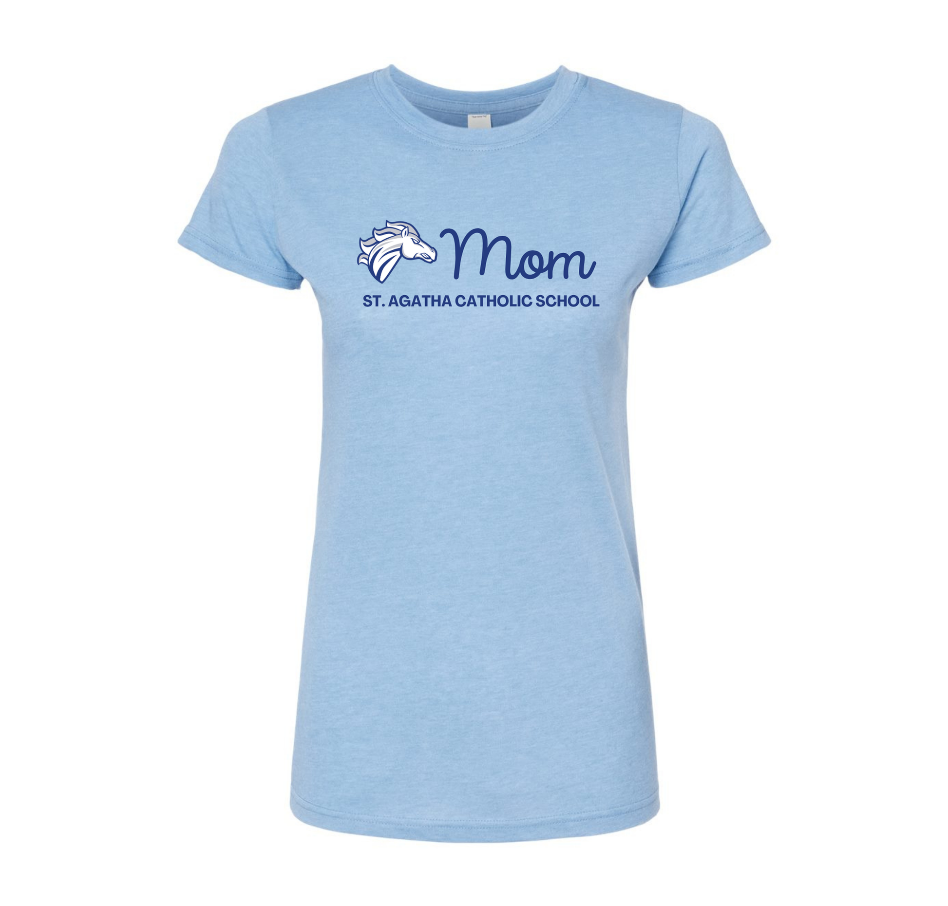 Celebrate your Mustang pride in style with the St. Agatha Mom T-Shirt in light blue! Crafted from a soft polyester/cotton blend, this slim fit tee features the bold Mustangs logo alongside St. Agatha lettering for a spirited look. Perfect for school events, spirit days, or everyday wear. A flattering and stylish staple for every proud St. Agatha mom!
